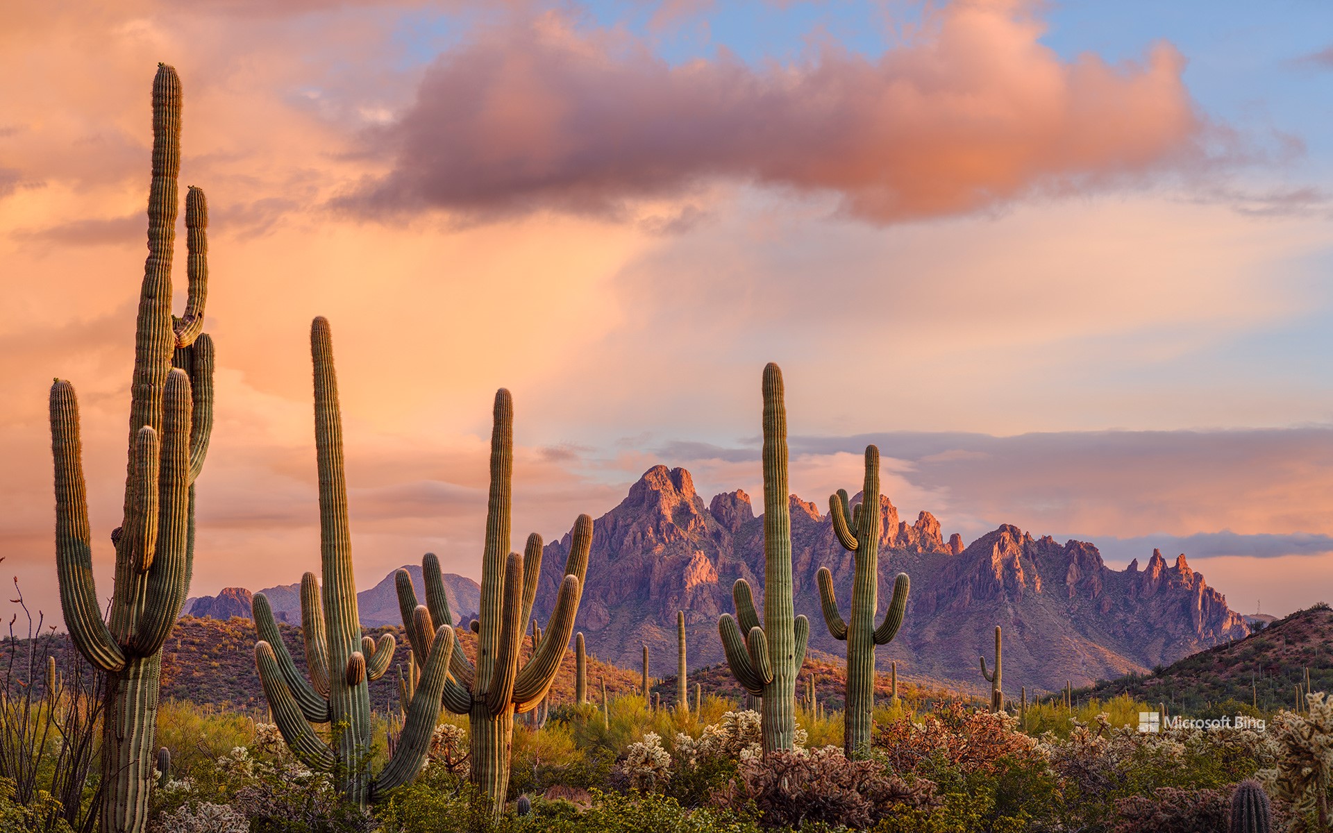 在亚利桑那州阳光普照的天空下,大片的仙人掌在群山的映衬下格外显眼。照片上的是巨人柱仙人掌,拍摄于铁木森林国家纪念地。即使你没有亲眼见过巨人柱仙人掌,但当你听到“巨人柱”这个名字时,也能联想到它们的样子:苍绿高大的圆柱形仙人掌,直指天空。虽然巨人柱生长缓慢,但它们的寿命超过200年,有足够的时间慢慢生长,创纪录的一株巨人柱仙人掌甚至高达78英尺。曾有一株被称为“老爷爷”的仙人掌存活了约有300年,最终在20世纪90年代寿终正寝。