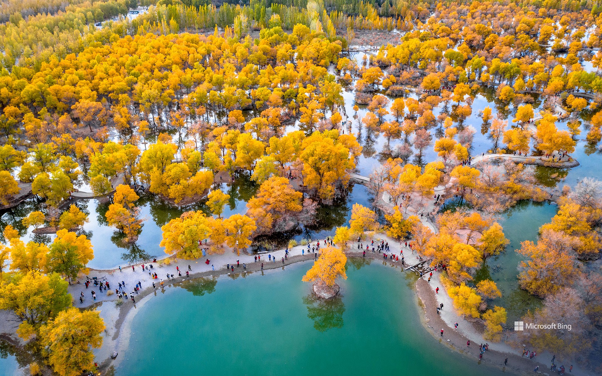 被胡杨树围绕着的湖, 金塔县, 酒泉, 甘肃, 中国 Lake surrounded by euphrates poplar trees, Jinta, Jiuquan, Gansu, China (© Feng Wei Photography/Getty images)