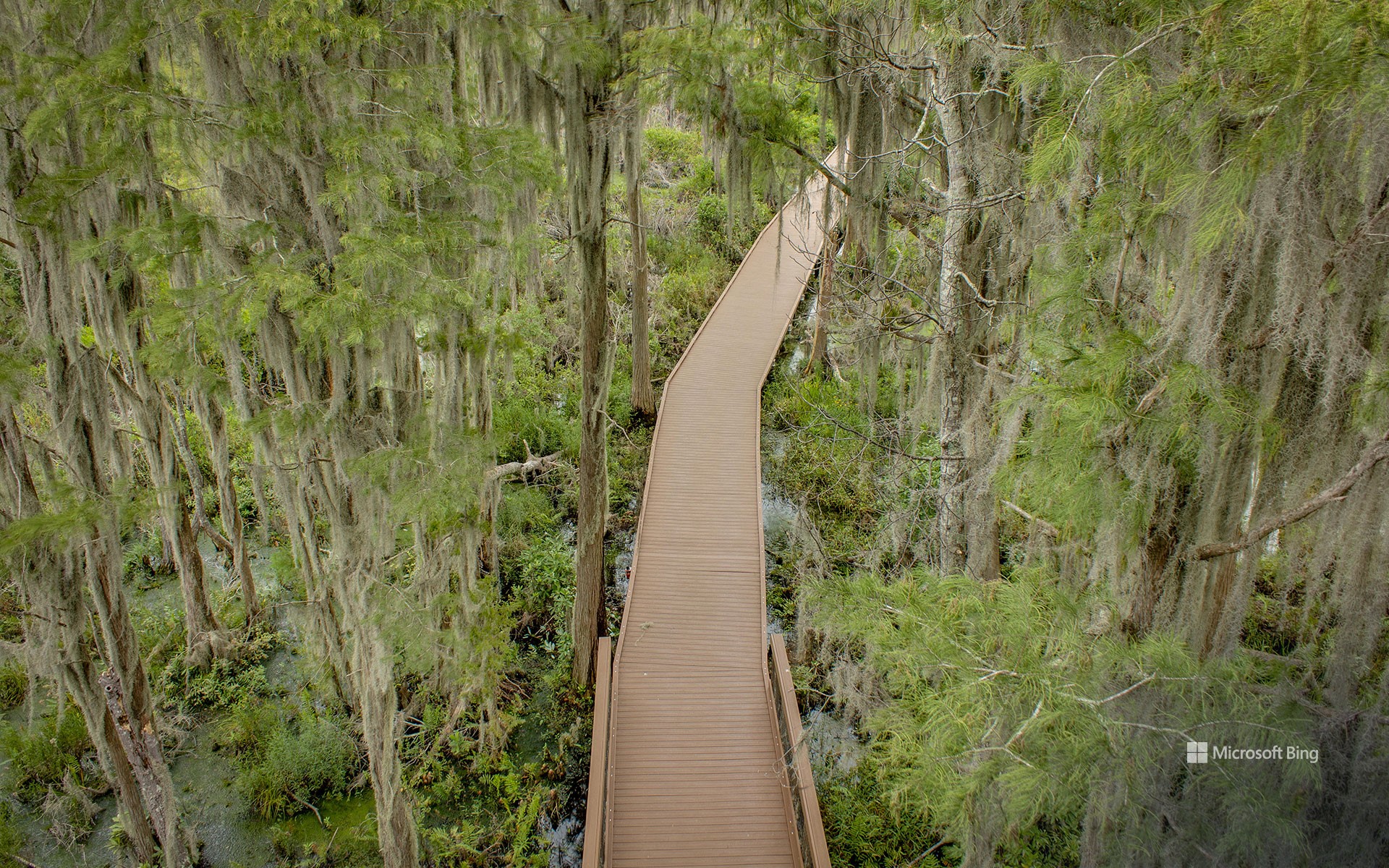 奥克弗诺基沼泽木板路上的西班牙苔藓,佐治亚州,美国 Spanish moss trees over a boardwalk in the Okefenokee Swamp, Folkston, Georgia (© Emmer Photo/Alamy)
