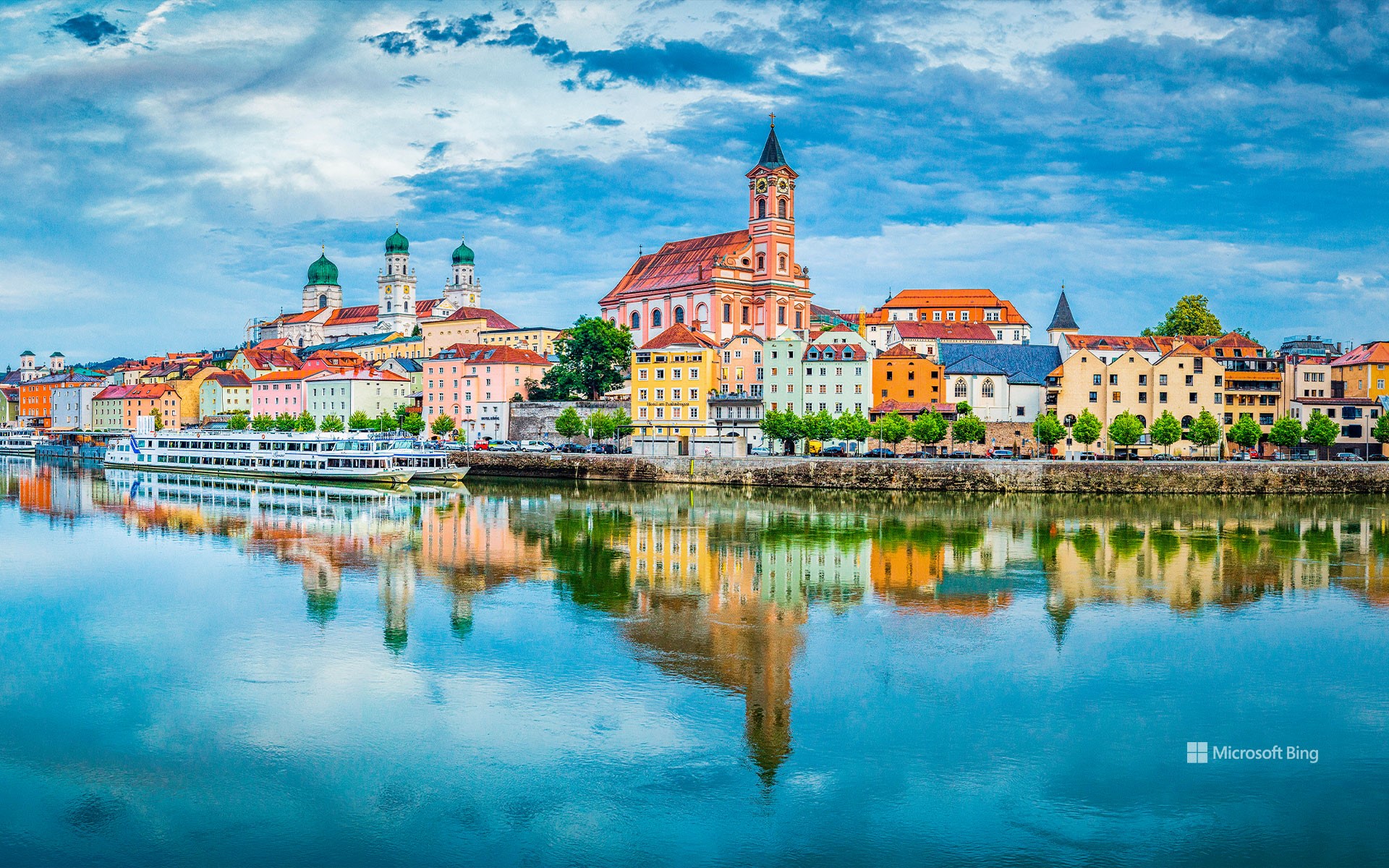 多瑙河畔的帕绍市,巴伐利亚,德国 The city of Passau reflecting in the Danube river, Bavaria, Germany (© Scott Wilson/Alamy)