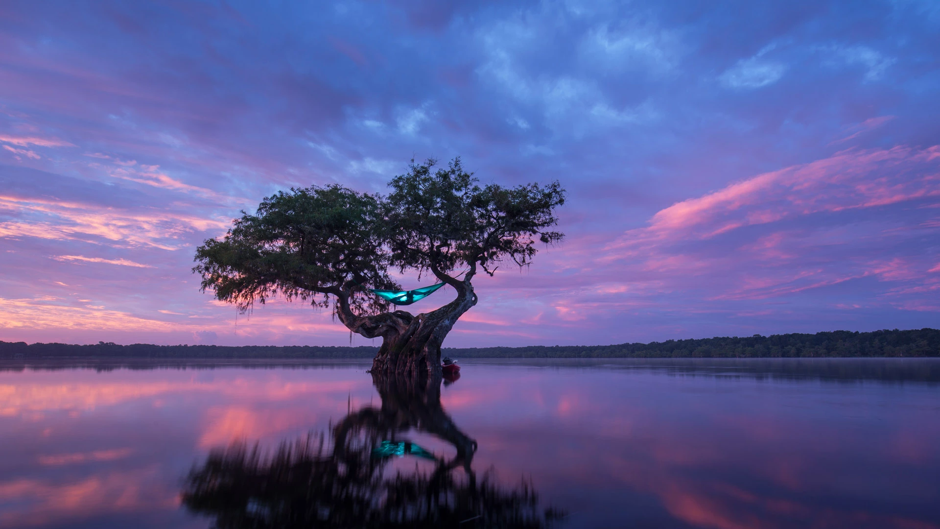 在一棵秃柏树上吊床露营,佛罗里达州