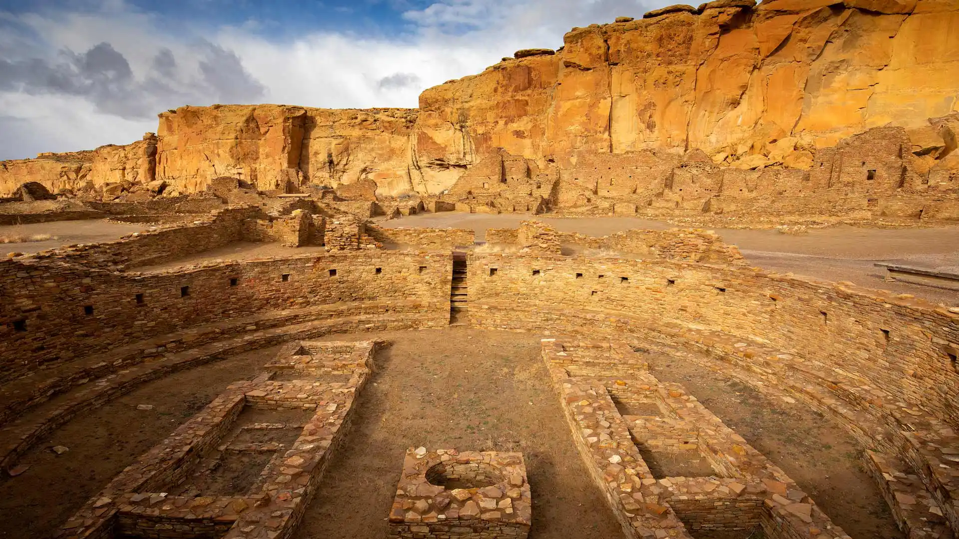 These circular walls belong to Pueblo Bonito, one of the biggest great homes in Chaco Culture National Historical Park, New Mexico. Between around 850 CE and 1250 CE, Chaco Canyon became a major cultural center for the Ancestral Puebloans, who lived in what is now known as the Four Corners region.