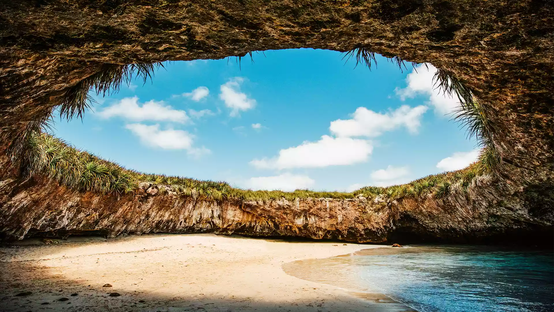 This gorgeous shot was taken at Playa del Amor—aka Hidden Beach—a remote destination off the coast of Puerto Vallarta, Mexico, known for its pristine beauty. To get to it, visitors need to take a boat toward the mouth of Banderas Bay at the base of the Marietas Islands. Once there, they swim through a tunnel at low tide to reach the beach. The walls hide a sandy cove, where the turquoise waters contrast with flora-laden cliffs that perfectly frame the blue sky overhead. Playa del Amor (Lovers' Beach) is popular among tourists, but the number of visitors is limited to preserve its natural beauty and ecosystem.