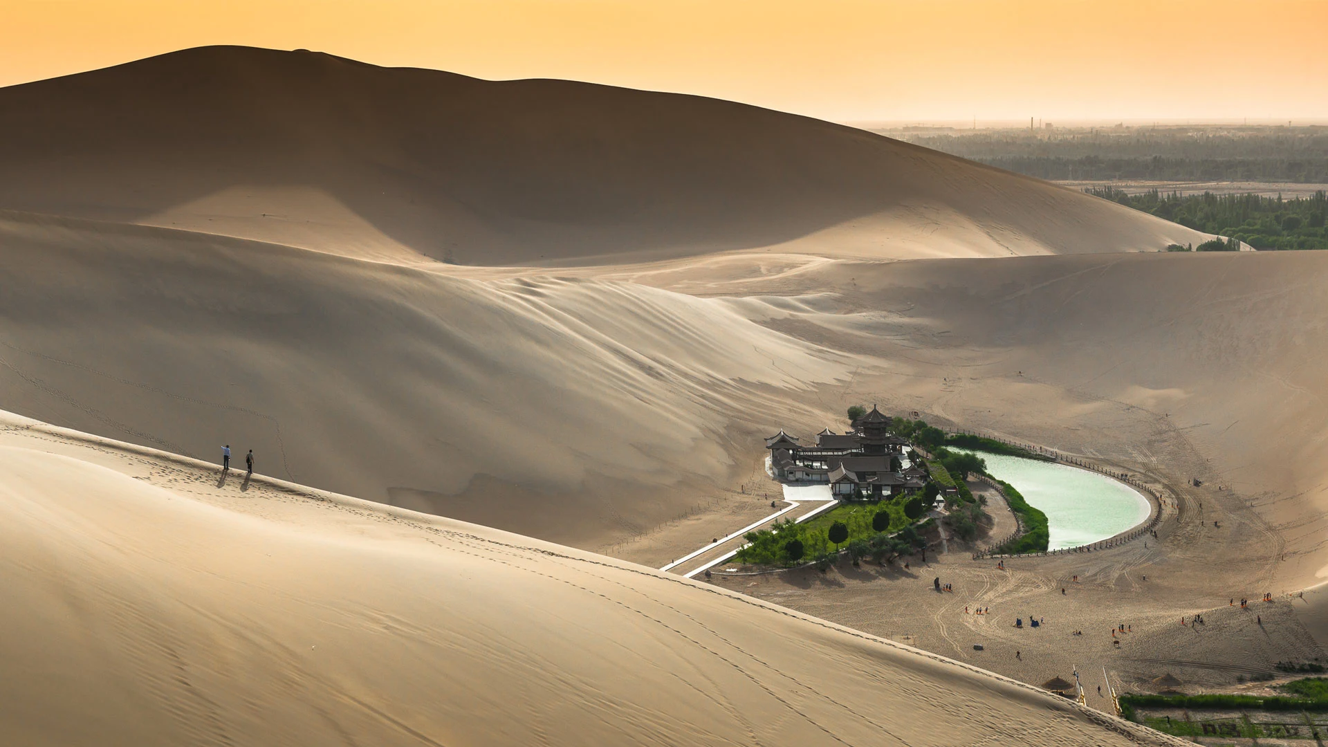 月牙泉位于中国甘肃省敦煌市附近,是隐藏在广袤戈壁滩上的一个摄人心魄的自然奇观。数百年来,这片因独特的月牙形状而闻名的绿洲,一直是一个重要的水源地。人们认为,月牙泉是风蚀形成的,其水源是地下泉水。由于附近有山脉遮挡,月牙泉才不会被该地的风沙所淹没。当地采取了许多保护措施,确保月牙泉不会干涸。游客不仅可以在湖上划船、骑骆驼在沙漠徜徉,还可以在附近的莫高窟欣赏古代佛教壁画及雕塑。